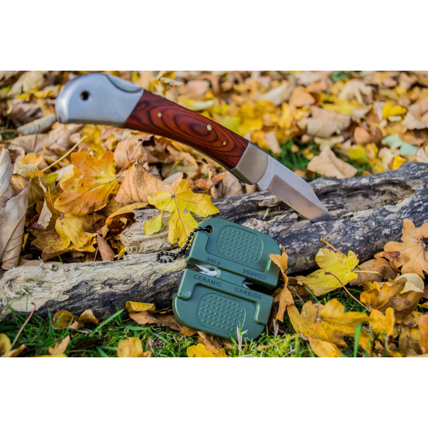 Deze Highlander Precision Knife Sharpener, gebruik eerst de gekruiste carbide messen voor een snelle rand instelling en daar gekruiste keramische staven voor de messcherpe afwerking. Door de metalen lus is hij handig aan je uitrusting vast te maken zodat je hem bij de hand hebt wanneer nodig. De onderzijde is voorzien van anti-slip om hem stevig vast te kunnen houden tijdens het slijpen.