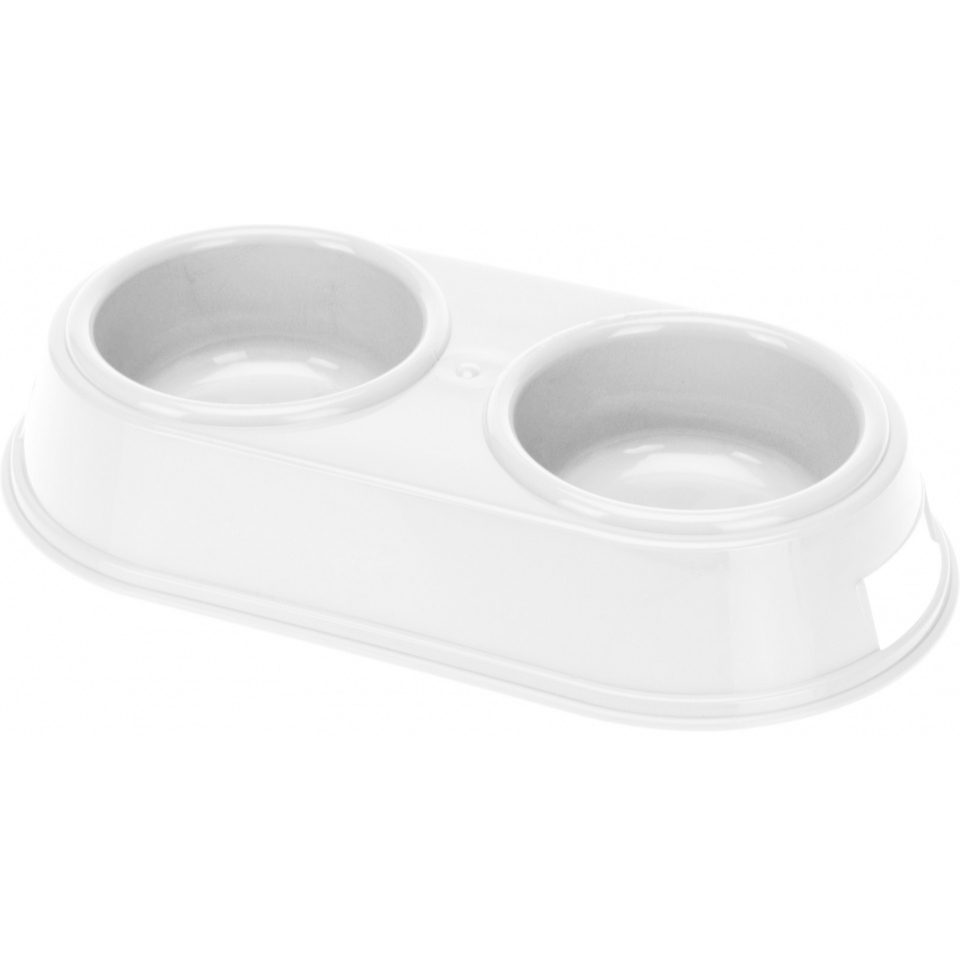 Deze dubbele voer- en drinkbak is erg fijn voor jouw hond of kat om uit te eten en te drinken. De bak is gemakkelijk te verplaatsen en op te pakken aan de opening in de zijkant. Kattenvoer- en drinkbak.