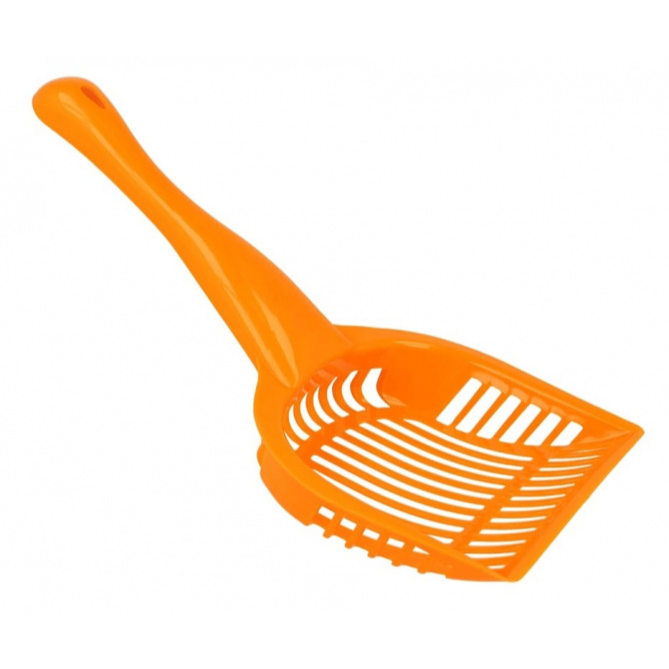 Kattenbakschep met een lengte van 28 cm en fijne mazen. Geschikt voor fijn kattengrit, dat via de mazen bij het uitscheppen terug de bak in valt.