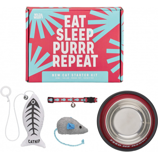 Een leuk en compleet setje voor jouw katje. De set is voorzien van twee speeltjes, een muis en een vis. Verder bestaat de set uit een voer- en drinkbak en een halsband met een belletje. Starterset kat.