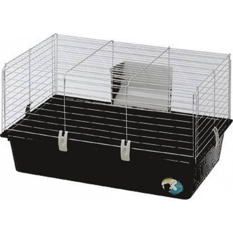 Deze stevige kooi is ideaal voor cavia’s. De kooi bestaat uit stalen tralies en een stevige kunststof bodem. De bodem kan makkelijk worden losgekoppeld van de kooi zelf en de voorpanelen kunnen volledig openen. De kooi wordt geleverd met accessoires zoals een hooirek, een voerbak, een waterfles en een huisje. Caviakooi binnen.