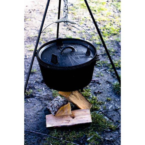 Wat ideaal is boven open vuur koken, is onze stalen Driepoot. In no-time op te zetten! Zet de drie poten iets uit elkaar, ketting met haakje in het midden bevestigen en je hangt zo je Dutch Oven eraan boven het vuur. Bovendien is de ketting te verstellen, op die manier regel je de temperatuur in je Dutch Oven. Handig he?
