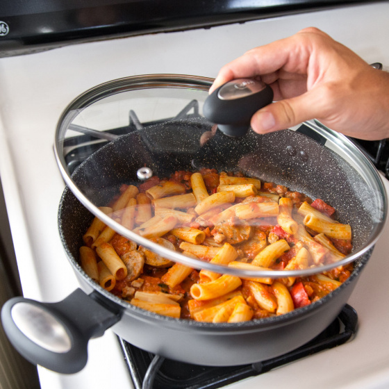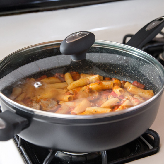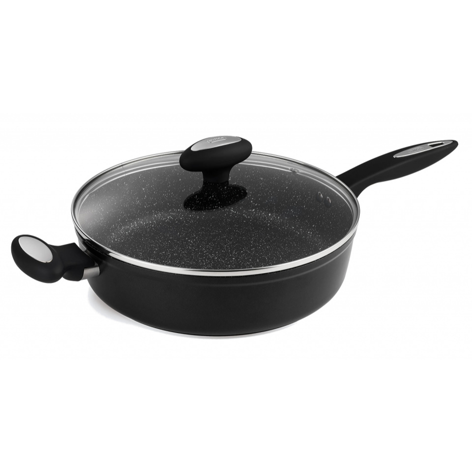 De Cook pannen van Zyliss zijn uitgerust met de geavanceerde RockpearlPlus non-stick technologie, een gecombineerd procédé van oppervlaktebehandeling en antikleefcoating, exclusief samengesteld voor Zyliss door het Zwitserse Ilag. De antikleefcoating is opgebouwd uit 3 lagen en staat garant voor optimale anti-aanbak eigenschappen. Voor het aanbrengen van de coating worden de pannen in gietaluminium onder hoge druk gestraald met metaalpartikels, waardoor een ruw oppervlak ontstaat dat een perfecte en duurzame hechting garandeert. De toplaag van de coating behoudt dit aspect en geeft de binnenzijde van de pan een gestructureerde graniet finish, waardoor olie en vet minder in contact komen met het voedsel in de pan. De pannen hebben een soft touch ergonomische greep voor maximum comfort en controle bij het hanteren. De greep is stevig met rivetten bevestigd. Uitgerust met een inductiebodem, is deze reeks geschikt voor alle warmtebronnen inclusief inductie. De pan wordt geleverd met deksel en is voorzien van een praktisch ophangoog. Hij is vaatwasmachinebestendig en geschikt voor de oven tot 180°C.