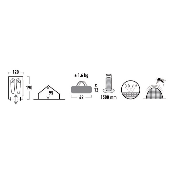 Tweepersoons klassieke tent met ingenaaid grondzeil en rechte wand voor meer ruimte. Snel en eenvoudig op te zetten door twee stalen rechte palen. Muggennet ingang houdt insecten uit het slaapgedeelte, tijdens warme dagen raden we aan om het gaasgedeelte van de deur te gebruiken voor extra ventilatie.