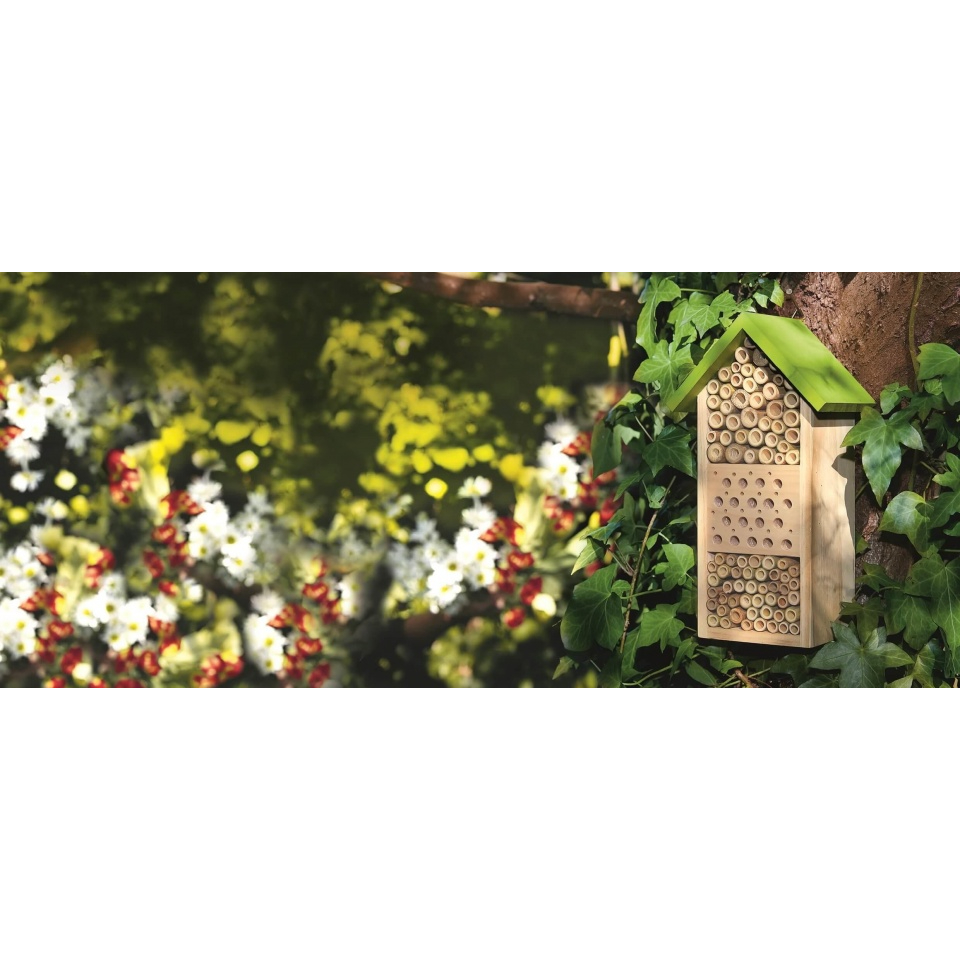 Hoe mooi staat dit in je tuin! Dit bijenhotel is gemaakt van vurenhout en bamboe en is geschikt als verblijfplaats voor wilde bijen.