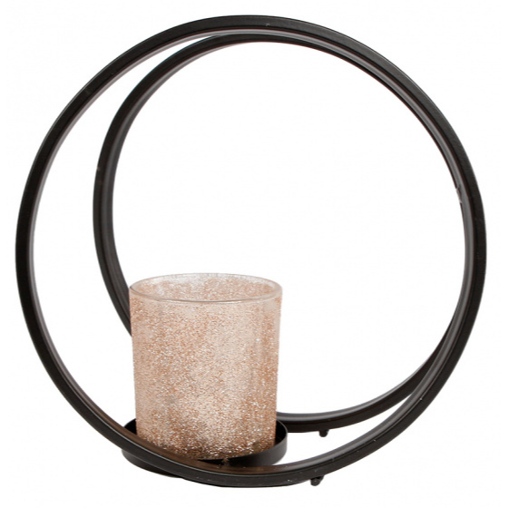 Deze stijlvolle theelichthouder brengt sfeer in jouw huis! De theelichthouder bestaat uit twee zwarte metalen ringen met een gouden theelichthouder in het midden. Plaats hem op je tafel of dressoir als mooie accessoire.